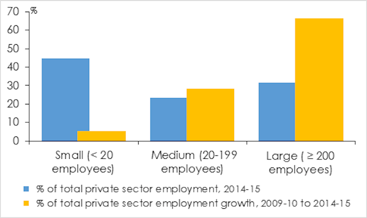بر اساس آخرین داده های موجود ABS ، کسب و کارهای کوچک (تعریف شده به عنوان آنهایی که کمتر از 20 کارمند دارند) کمتر از 45 درصد از نیروی کار بخش خصوصی را در ژوئن 2015 به کار گرفته اند. اشتغال در طول پنج سال منتهی به ژوئن 2015.