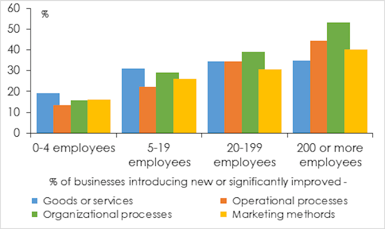به طور مشابه، نسبت کمتری از این مشاغل کوچک در هر یک از چهار دسته از نوآوری‌هایی که ABS در بررسی سالانه نوآوری کسب‌وکار به رسمیت می‌شناسد، نسبت به مشاغل متوسط ​​یا بزرگ شرکت می‌کنند.