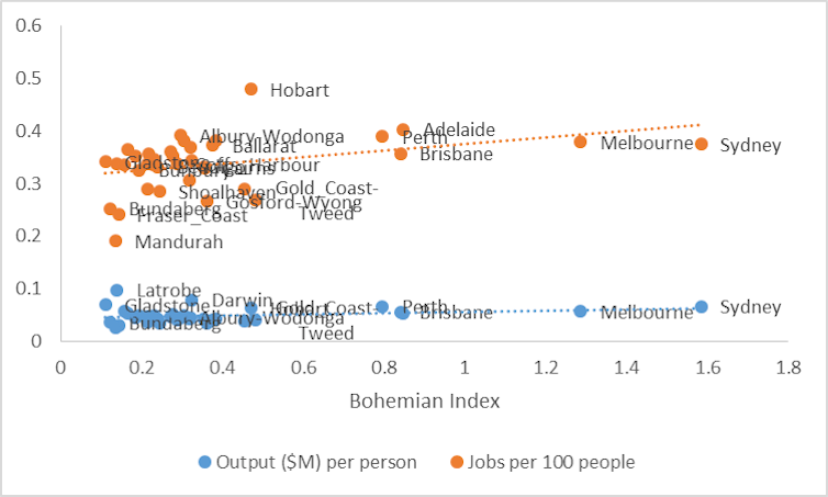 یافتههای استرالیایی هیچ ارتباطی بین خلاقان و بازده شهر نشان نمیدهد که به عنوان ارزش افزوده ناخالص ( GVA ) سرانه اندازهگیری میشود. همانطور که در زیر نشان داده شده است، فقط یک رابطه مثبت جزئی بین شغل و خلاقیت وجود دارد. در مقابل، شاخص شهرهای خلاق و فرهنگی اروپا همبستگی بالایی و مثبت با تولید ناخالص داخلی و سرانه مشاغل دارد.
