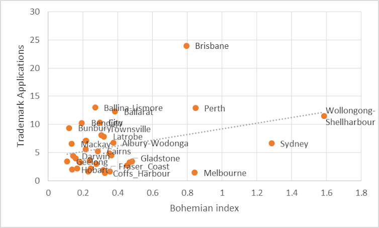 بنابراین شهرهای استرالیا از نظر اقتصاد خلاق و عملکرد اقتصادی چه اشتراکی با شهرهای اروپایی دارند؟ اساساً، یک همبستگی مثبت و قوی بین شاخص بوهمی یک شهر و نرخ راه اندازی کسب و کار جدید، نرخ علامت تجاری (نگاه کنید به شکل 2) و نرخ صاحبان مشاغل وجود دارد.